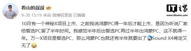 值得一提的是,该博主昨日曾透露 10 月有一个神秘 X 项目上市,之前他认为鸿蒙 PC 得一年后才能上市。万一 X 项目是智选 PC,那么鸿蒙 PC 也就还有半年就要出了。