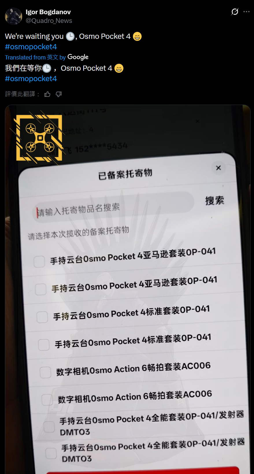 结合IT之家此前报道,这名消息人士还在 1 月 21 日分享了一张可信度较高的仓库库存管理应用截图,显示大疆 Osmo Pocket 4 云台相机已抵达主要零售商处。