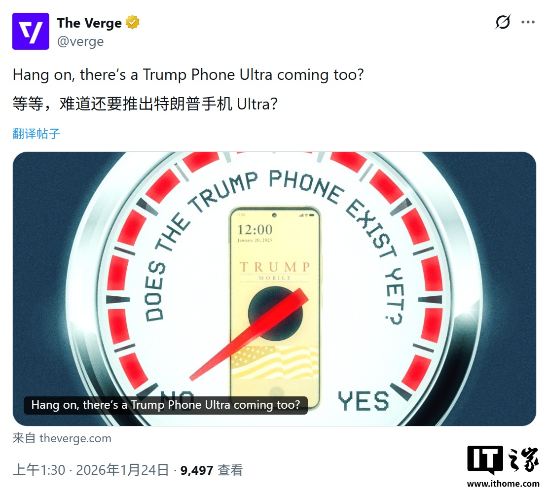 IT之家 1 月 24 日消息,科技媒体 The Verge 今天(1 月 24 日)发布博文,报道称尽管初代 T1 手机尚未发货,特朗普移动(Trump Mobile)高管唐 · 亨德里克森(Don Hendrickson)透露,公司已规划名为 T1 Ultra 的高端后续机型。