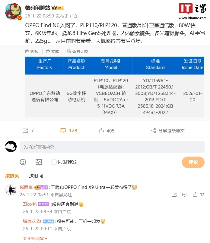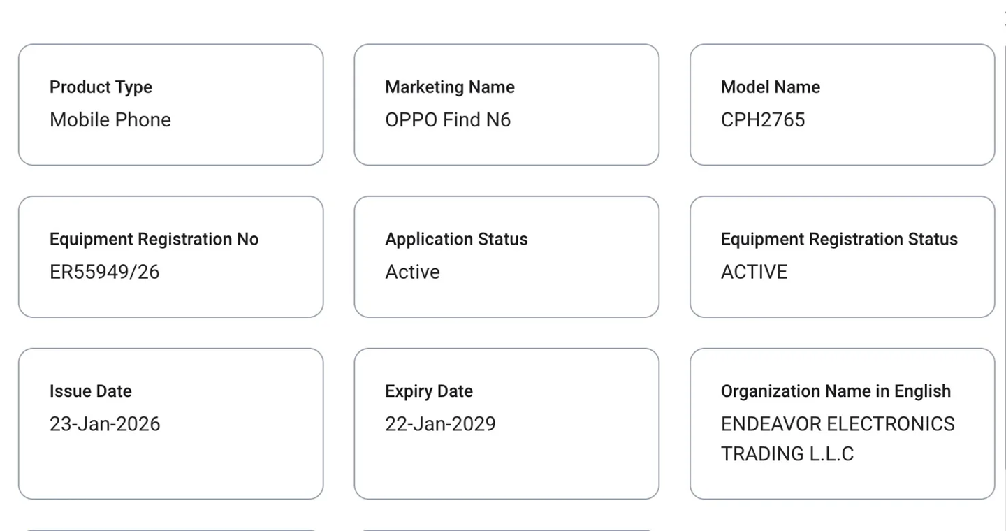 IT之家 1 月 24 日消息,据科技媒体 NoteBook Check 今天报道,OPPO Find N6 折叠屏手机现已出现在多地监管机构的认证数据库中,有望推出全球版本。