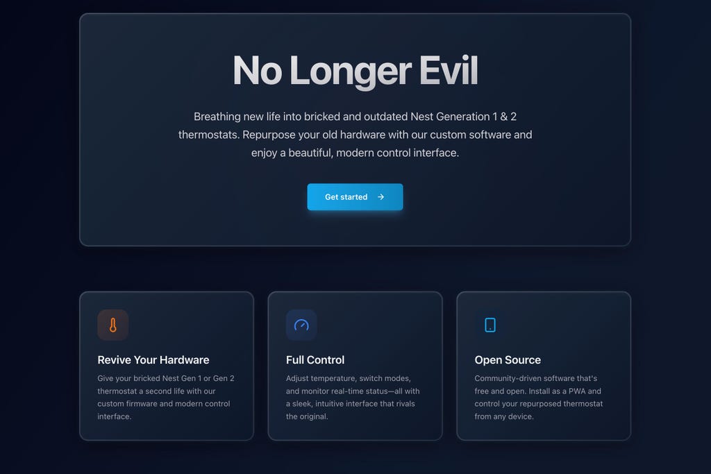 No Longer Evil创建免费的开源软件,潜入并替换Nest固件,采用某种“盗版”版本以恢复远程控制和其他监控功能,而无需Nest、谷歌或谷歌家庭应用。