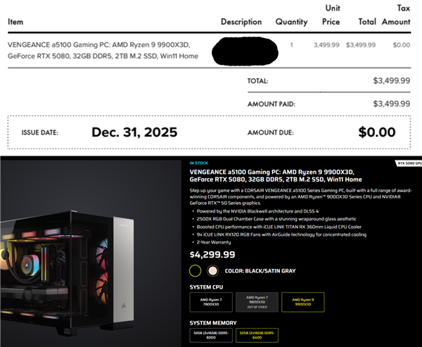 新年前夕,有网友以3499美元的价格买了一台海盗船PC,也是被取消订单,然后发现价格变成了4299美元。