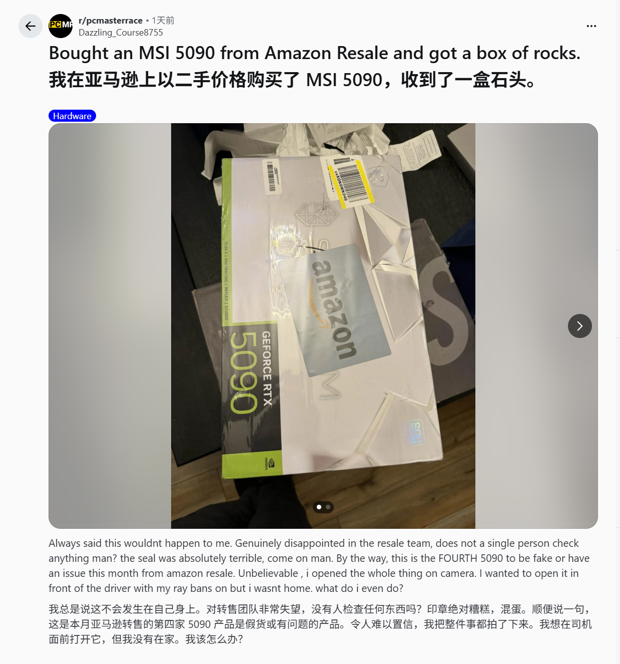 这名玩家在帖文中表示,他通过亚马逊 Resale 翻新 / 二手渠道订购了这块显卡,在此渠道销售的基本都是退货商品,经过重新包装后再进行销售,但他收到货后开箱才发现,包装盒里并没有显卡,只有一块裹着浴巾的石头。