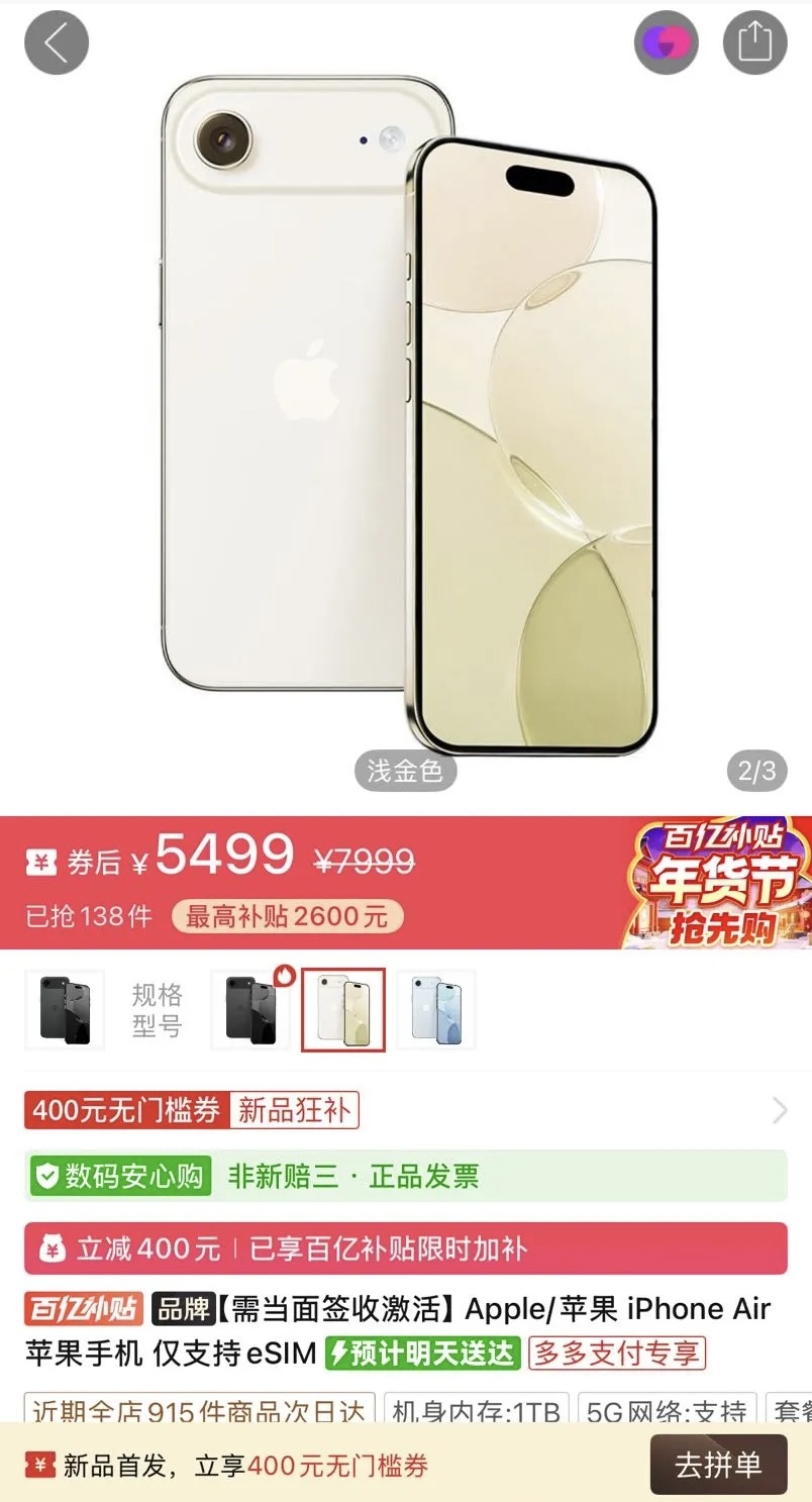 值得注意的是,拼多多百亿补贴的参战,似乎预示着 iPhone Air 在第三方渠道后续将维持在 5000 元价位档、甚至被打到更低。