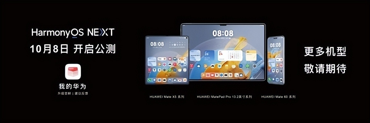 2024年9月24日,在华为秋季全场景新品发布会上,余承东宣布,HarmonyOS NEXT将于10月8日正式开启公测,首批公测机型包括华为Mate 60系列、华为Mate X5系列和华为MatePad Pro 13.2系列。至此HarmonyOS NEXT已经为大批量推送、满足用户日用需求准备好,占消费者使用时长99.9%的超1万个应用和元服务已上架到鸿蒙应用市场,不再需要担心遇到无应用可用的问题。