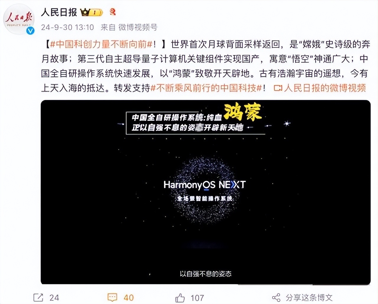 HarmonyOS NEXT“登上”人民日报喽!在9月30日人民日报发布的献礼国庆科技盘点视频中,HarmonyOS NEXT和嫦娥六号探月、蛟龙号下潜等科技创新一同亮相,作为中国75年来自主研发成就和技术力的代表。