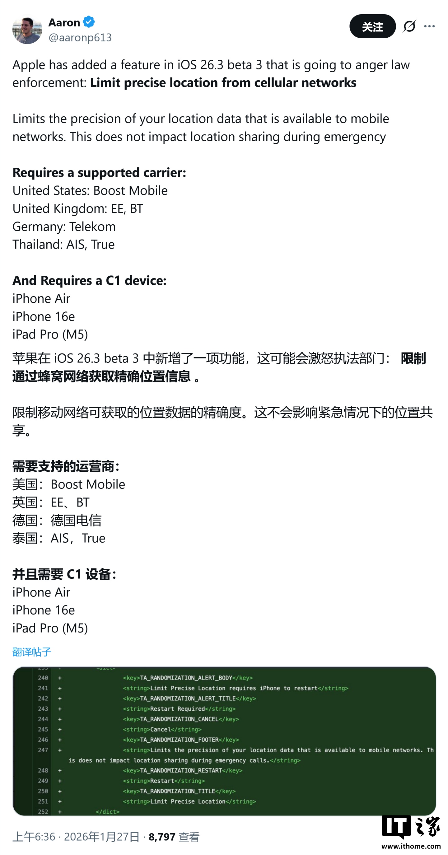 IT之家 1 月 27 日消息,苹果公司昨日(1 月 26 日)更新支持文档,详细解读了 iOS 26.3 中新增的“限制蜂窝网络获取的精确位置”功能。