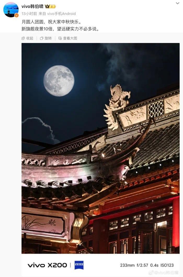 而vivo高管也在微博上释出了vivo X200标准版的夜景10x样张,今年vivo的标准版应该是加强了长焦拍摄的能力,继续巩固vivo数字系列在影像层面的优势。
