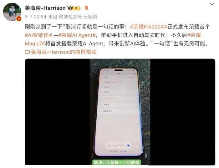 目前网络上可以看到的信息并不算太多,主要的内容还是围绕全新的AI体验,让人印象比较深刻的就是荣耀AI智能体(Agent)的“一句话关闭App自动续费”功能,这个功能放眼整个科技行业,也是荣耀独一家的,可以观望下新机落地后的效果。