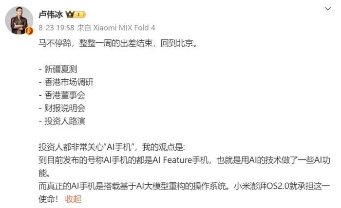 早在8月份,小米高管卢伟冰就已经提及“AI手机”的概念,并称这将是小米澎湃OS2.0的重要使命,而小米15系列手机不出意外的话将会搭载澎湃OS2.0系统,也就是说AI功能极大概率成为小米15系列最大的更新亮点。