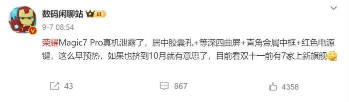 除了米OV之外,其他手机品牌也会在这两个月有大动作。首先就是荣耀的Magic7系列新机,相对于往年的滞后发布,这一代的荣耀旗舰新机直接提档了好几个月,而且大概率会挤到10月份的旗舰大乱斗中。