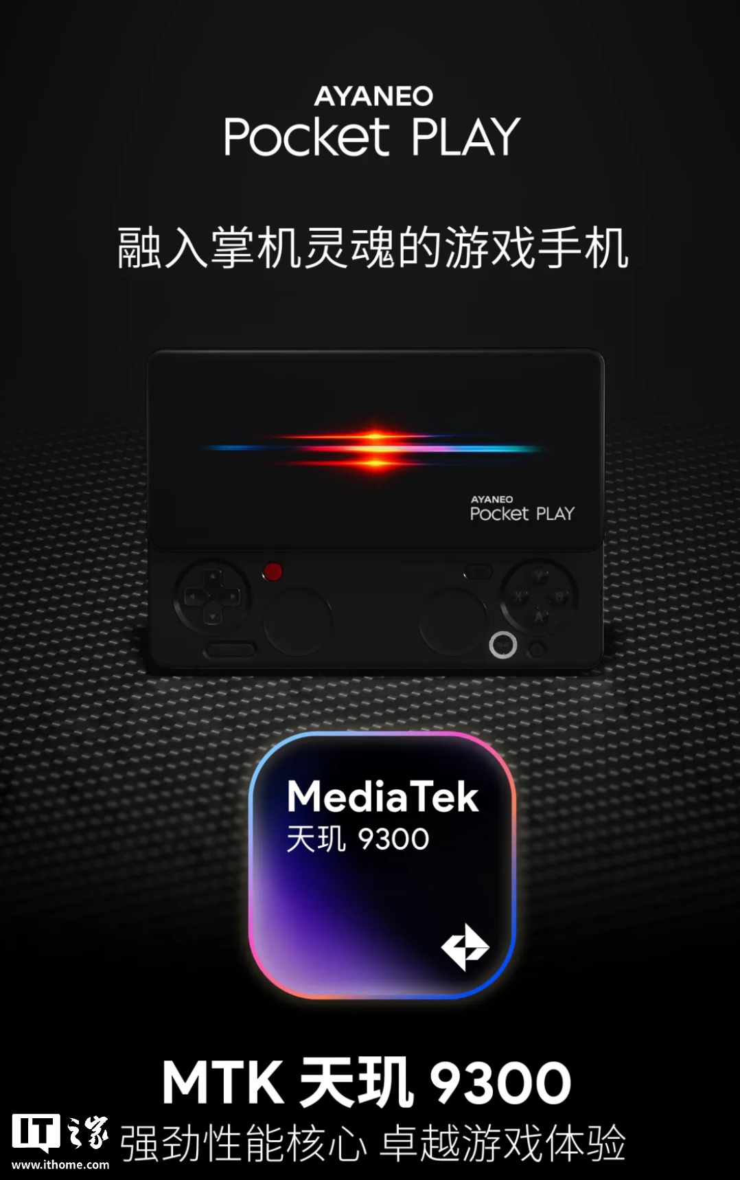 IT之家 1 月 30 日消息,AYANEO 现已预热旗下首款手机 Pocket PLAY 的部分规格信息,该机可选黑 / 银双色,搭载联发科天玑 9300 处理器,匹配隐藏式全功能手柄、标准手柄按键、双智能触控板,整体风格类似当年的索尼 Xperia PLAY。