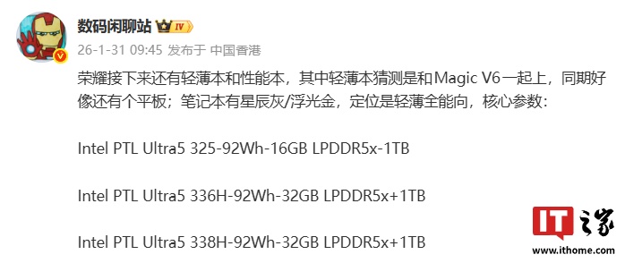IT之家 2 月 1 日消息,博主 @数码闲聊站 公布了三款荣耀笔记本电脑新品的核心配置。博主猜测,2026 款荣耀 MagicBook(Pro)轻薄本新品将与下一代折叠屏旗舰手机 Magic V6 同期发布(今年 3 月),届时可能还有新款 MagicPad 平板电脑亮相。