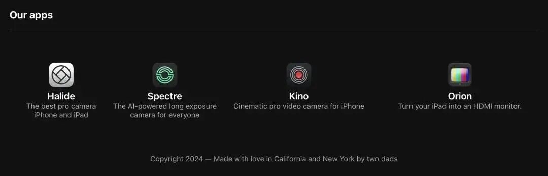 在 Lux Optics 的底部,陈列着这个小团队迄今为止开发的四个应用,并骄傲地写道: