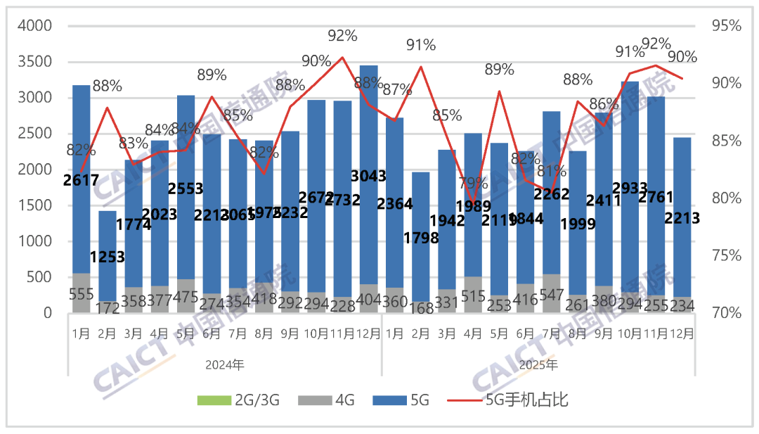 据中国信通院发布2025年12月国内手机市场运行分析报告显示,2025年12月,国内市场手机出货量2447.3万部,同比下降29.1%,其中,5G手机2213.2万部,同比下降27.3%,占同期手机出货量的90.4%。12月,国内手机上市新机型41款,同比增长28.1%,其中5G手机11款,同比增长37.5%。