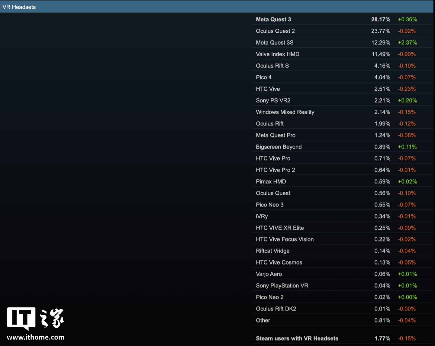 在 VR 头显方面,Meta Quest 3 头显最受欢迎,本月相应头显占比 28.17%,增长 0.36%;Meta Quest 2(Oculus Quest 2)头显位居第二,占比 23.77%,下降 0.92%。