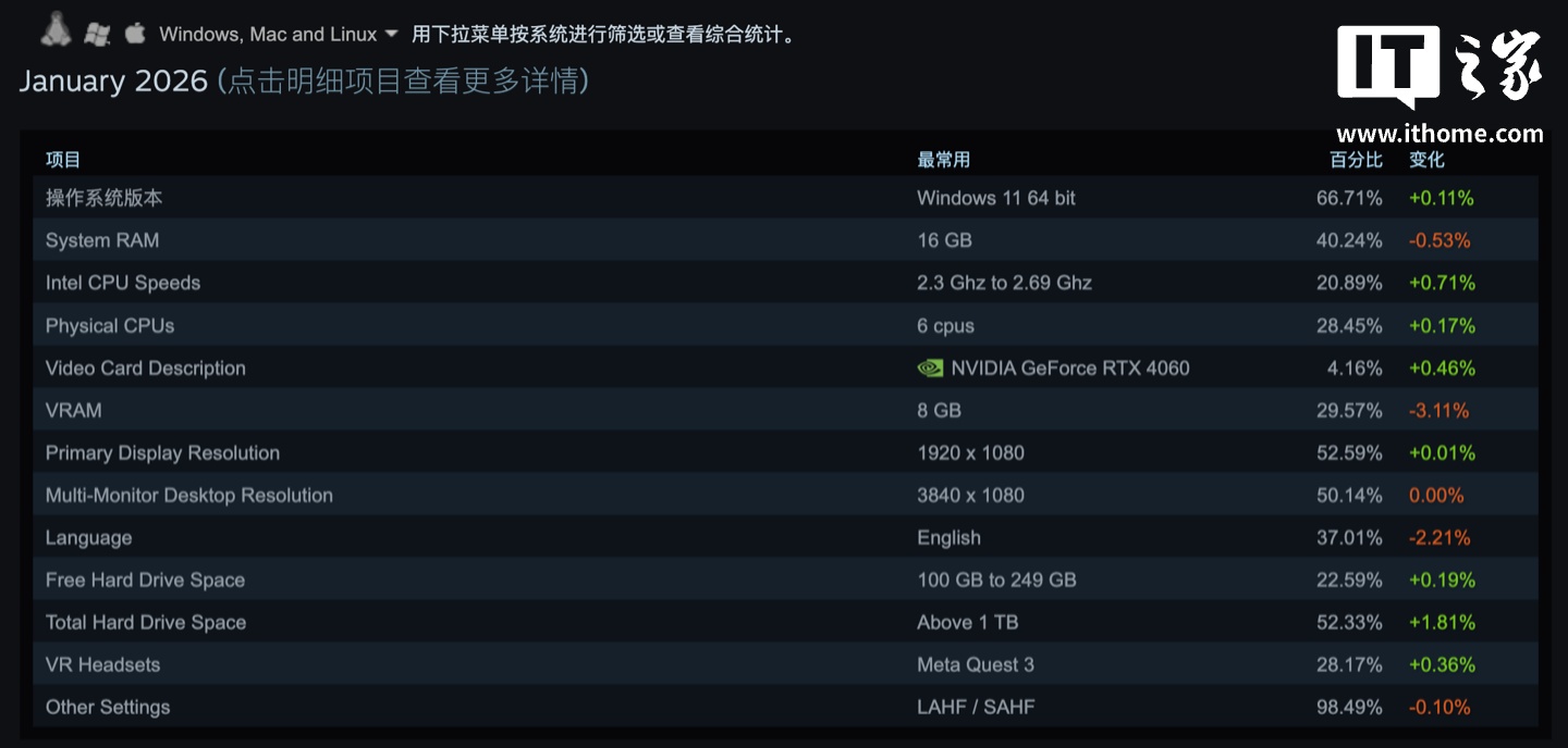 IT之家 2 月 2 日消息,Steam 平台今天公布了 2026 年 1 月玩家硬件报告,本月英伟达的 GeForce RTX 4060 登上显卡榜的榜首,玩家仍惯用 16GB RAM、1920x1080 分辨率产品。
