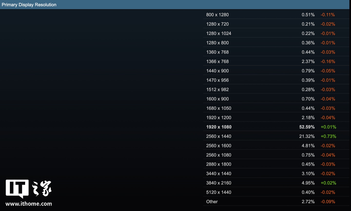 在显示器分辨率方面,1080P(1920x1080 分辨率)显示器仍最受欢迎,本月上升 0.01%,占比 52.59%。而 2K(2560x1440 分辨率)显示器排行第二,占比 21.32%,本月增长 0.73%,这证明玩家显示器分辨率呈逐渐上升趋势。