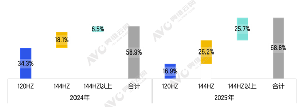 在这股浪潮中,144Hz最为激进,占比26.2%,成为了中高端市场的绝对主角。