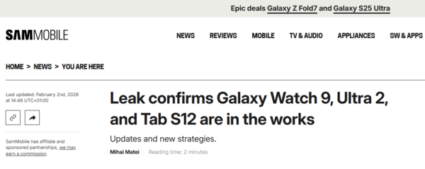 【CNMO科技消息】2月2日,据外媒报道,三星正在开发多款新设备,包括Watch 9、Watch Ultra 2(暂命名)以及Tab S12系列,相关设备的型号已现身于GSMA认证数据库。