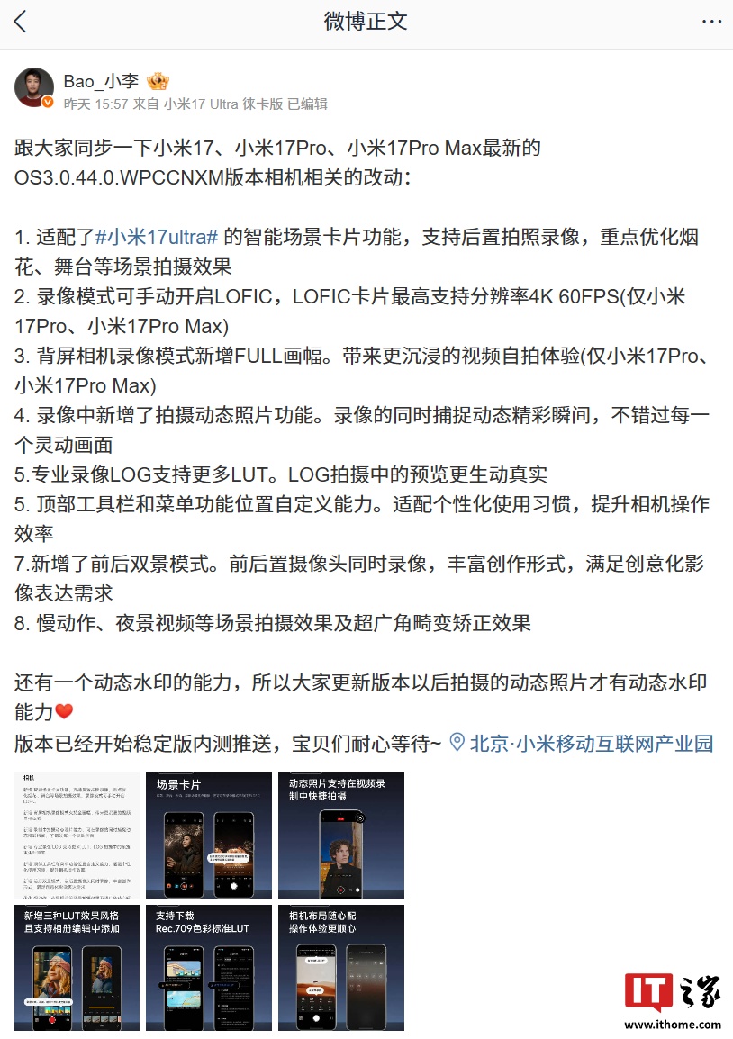 IT之家 2 月 4 日消息,小米相机部的产品经理 @Bao_小李 昨日在微博发文,同步了小米 17、小米 17 Pro、小米 17 Pro Max 最新的 OS3.0.44.0.WPCCNXM 版本相机相关的改动: