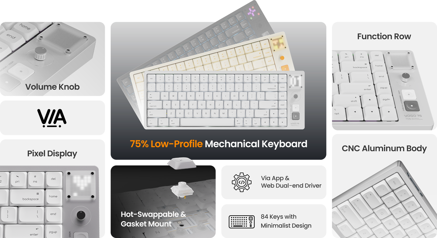 IT之家 2 月 4 日消息,ATK 最近面向海外市场推出了 Yogo 75 Pro 矮轴机械键盘。其采用 75% 配列和复古设计,右侧拥有点阵像素屏、小巧铝制旋钮和一对额外功能按键。