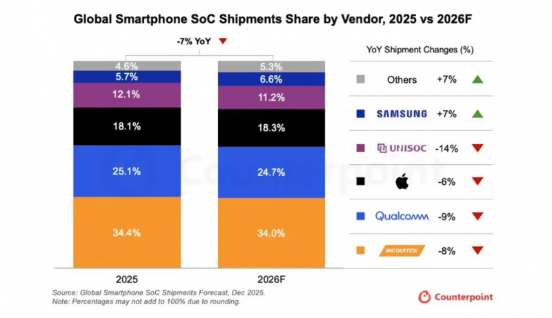 这种压力也传导到了手机芯片市场。Counterpoint Research预计,2026年全球智能手机出货量将同比下降6.1%,而智能手机SoC出货量预计较2025年同比下降7%。