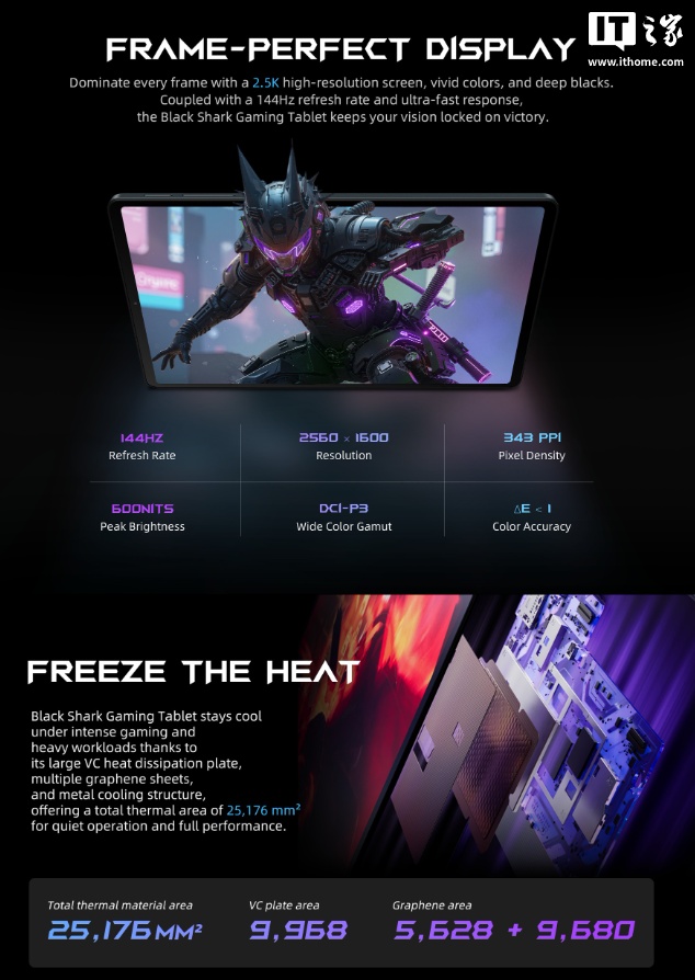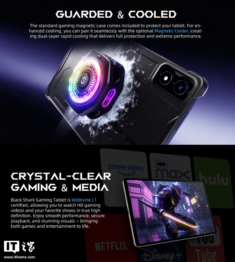 该平板配有均热板、多层石墨烯片和金属散热结构,黑鲨还提供可选的磁吸散热器。