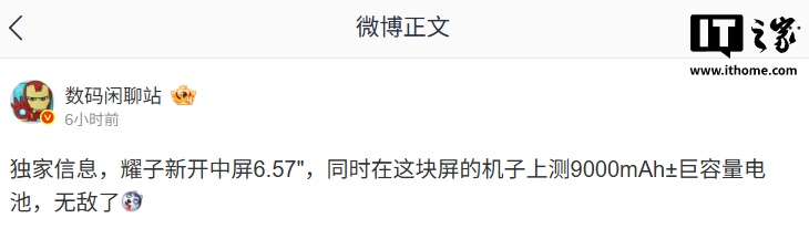 IT之家 2 月 6 日消息,据博主 @数码闲聊站 今日爆料,荣耀新开 6.57 英寸中屏新机,同时在这块屏的机子上测 9000mAh± 巨容量电池。