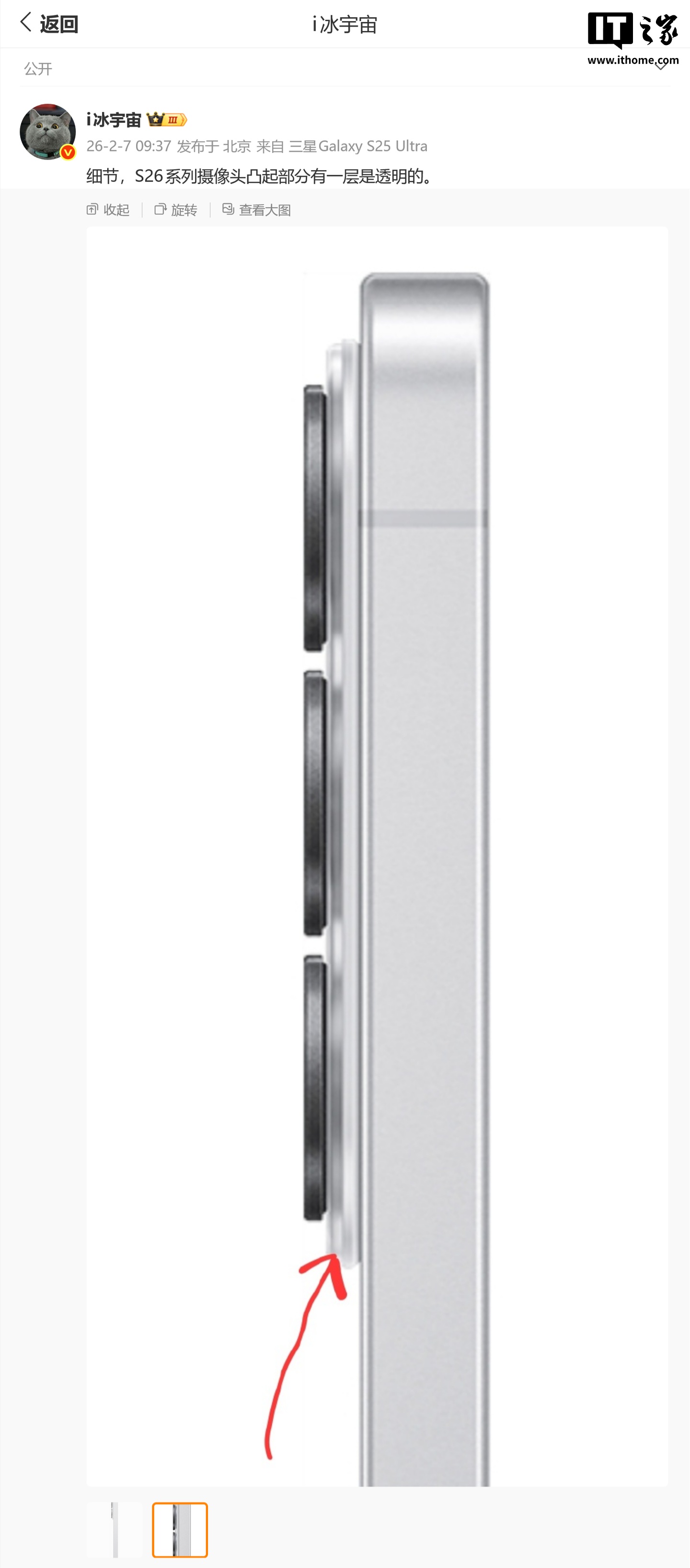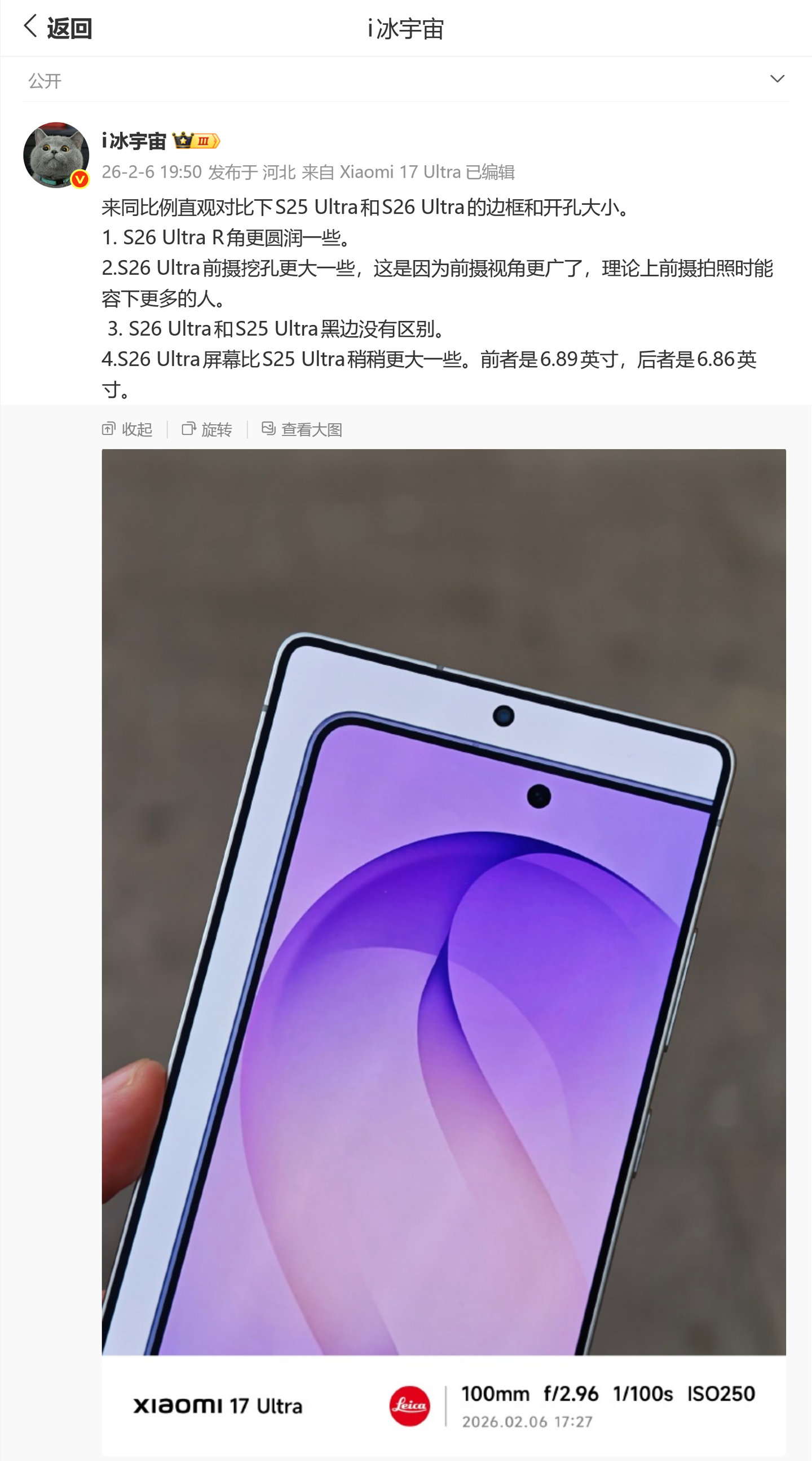 IT之家 2 月 7 日消息,消息源 @i冰宇宙 昨日(2 月 6 日)发布微博,分享了一张图片,同比例直观对比三星 Galaxy S25 Ultra 和 S26 Ultra 的边框和开孔大小。