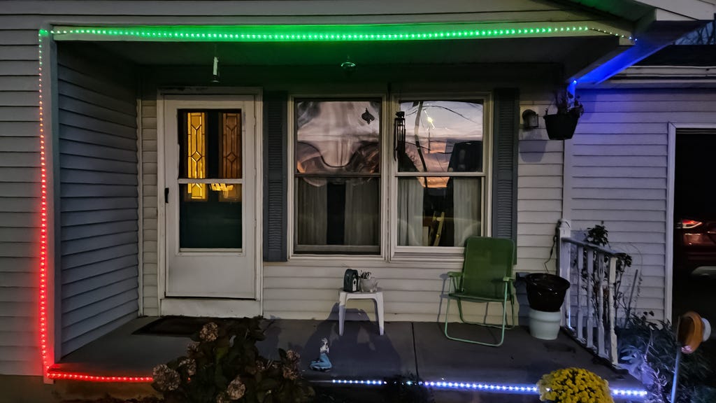 如前所述,我从亚马逊上挑选了几盒便宜的智能LED灯带,确保它们具备防水功能,并能提供我所需的照明模式(既有适合节日的绚丽选择,也有适合露台灯带的柔和中性模式)。
