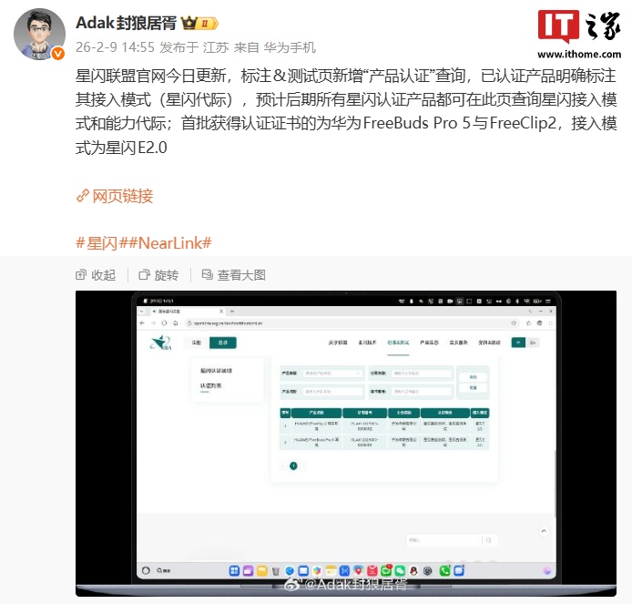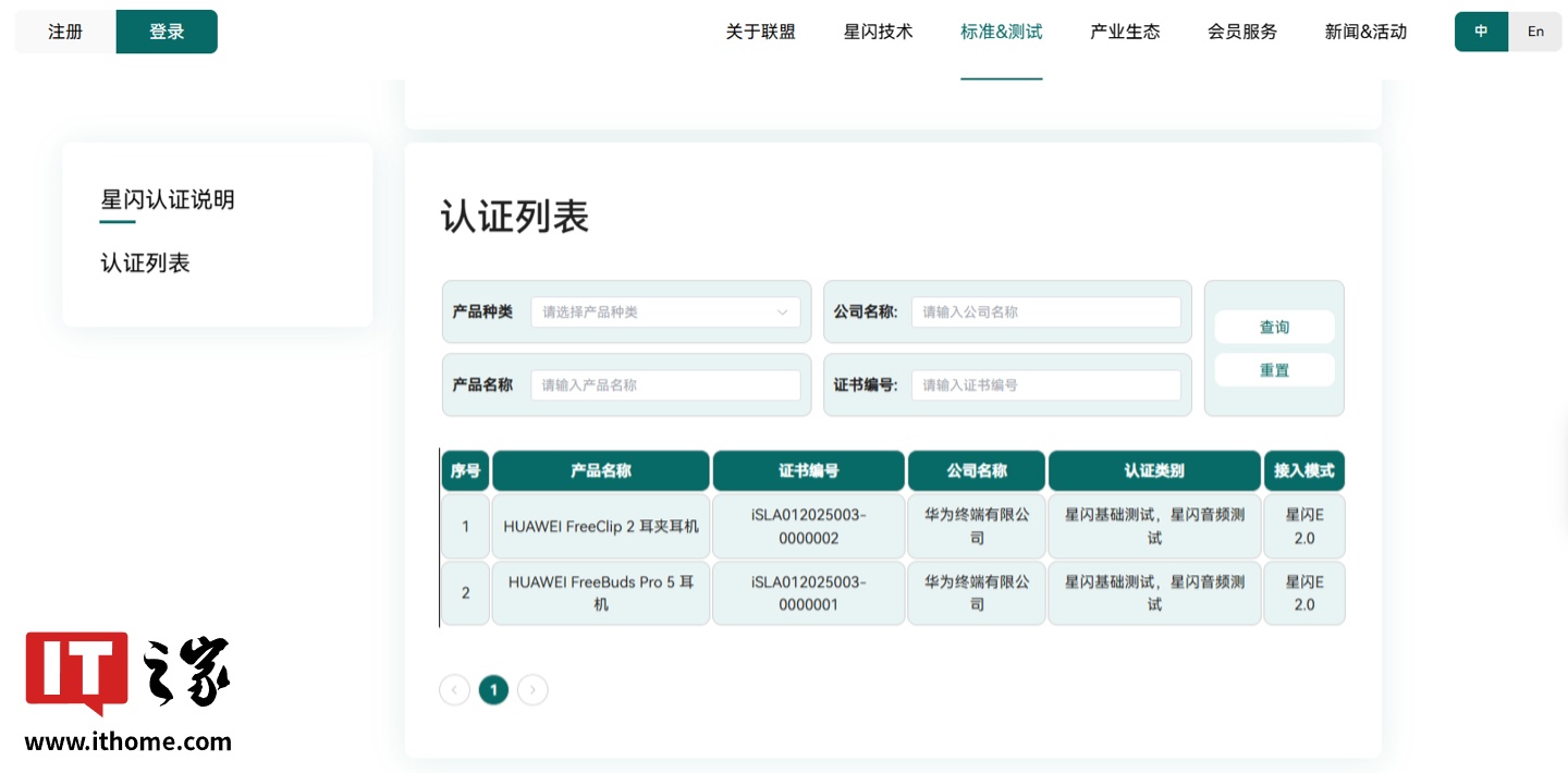 IT之家 2 月 9 日消息,星闪联盟官网迎来一波升级,在“标准 & 测试”模块新增了“产品认证”列表,目前可以看到 HUAWEI FreeClip 2 耳夹耳机和 HUAWEI FreeBuds Pro 5 耳机的相关信息。