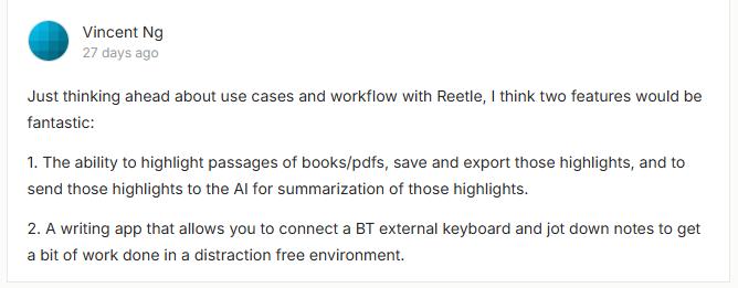 用户表示希望 REETLE SmartInk I支持高亮功能和外接键盘| 图源 Kickstarter