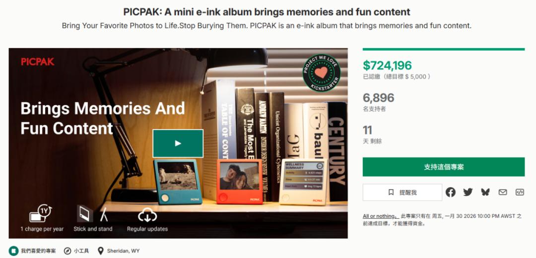 PICPAK 是一款口袋级的彩色墨水屏相册,上线 Kickstarter 半个多月,以 49 美元的单价,筹得约 70 万美元。