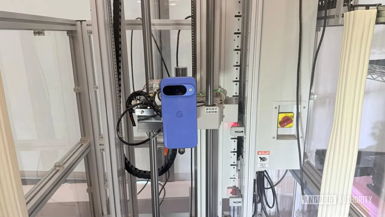 在可靠性实验室中,为了验证 Pixel 手机防水性能,设备会被置于旋转台上,接受长达 10 分钟的全角度喷水测试(模拟 IPX4 级暴雨或汗水场景),且屏幕在此期间需保持常亮。