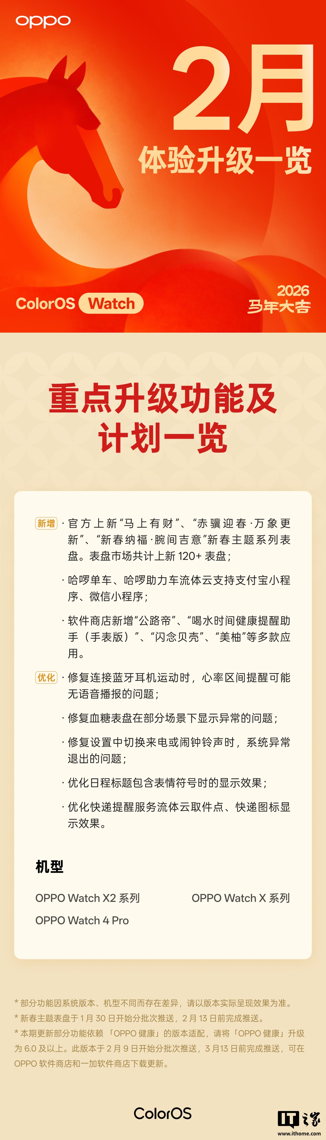 IT之家 2 月 12 日消息,OPPO ColorOS 官方微博昨日发文宣布,ColorOS Watch 春节升级体验陆续推送中,并发布了 2 月体验升级一览。