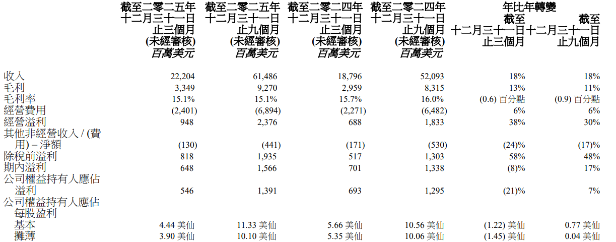 凤凰网科技讯 2月12日,联想集团公告称,第三季度营收222亿美元,同比增长18%,预估207.6亿美元;人工智能相关收入同比增长72%,占集团总收入达32%。第三季度净利润5.455亿美元;第三季度毛利率15.1%,预估15.4%。