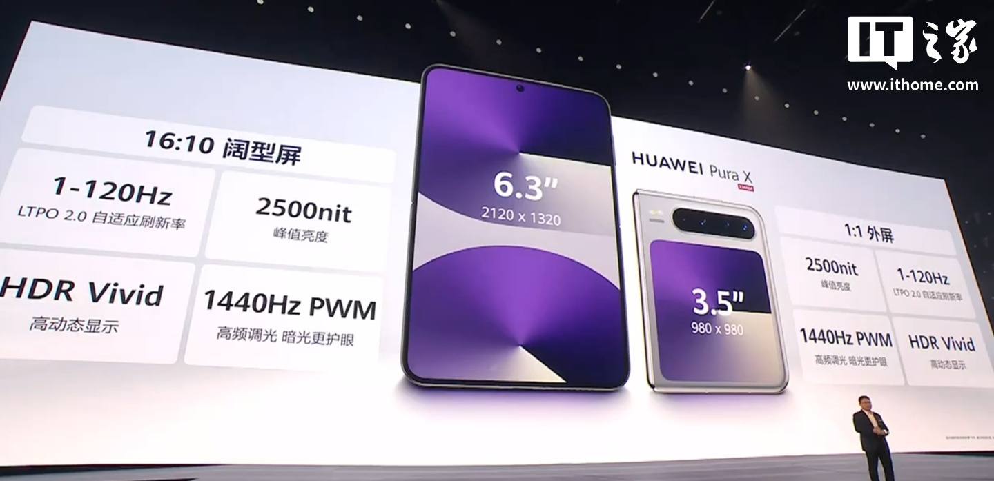 该博主所指的「阔屏手机」预计指类似华为 Pura X 屏幕比例的手机,参考IT之家此前报道,后者发布于今年 3 月 20 日,是首款全面搭载 HarmonyOS 5 系统的手机,配备了一块分辨率为 2120×1320 的 6.3 英寸 16:10 阔型屏,支持 1~120Hz LTPO 2.0 自适应刷新率、HDR Vivid、1440Hz PWM 调光。