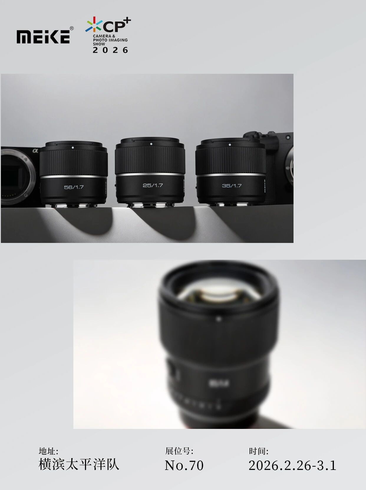 IT之家 2 月 13 日消息,美科官方前天在公众号平台宣布参加 CP+ 2026 摄影展,届时 AF85mm f/1.4 II、Air 系列“三剑客”两款新品将同台亮相。