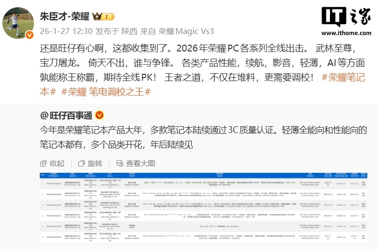 《2026 年荣耀 PC 各系列全线出击,多款笔记本通过 3C 认证》