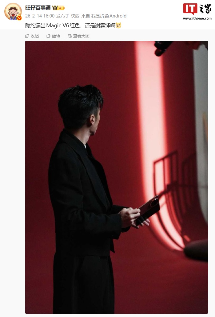 IT之家 2 月 15 日消息,博主 @旺仔百事通 昨日分享了一张照片,画面显示谢霆锋正手持一款折叠屏手机。博主透露,这款手机是荣耀 Magic V6 的红色。