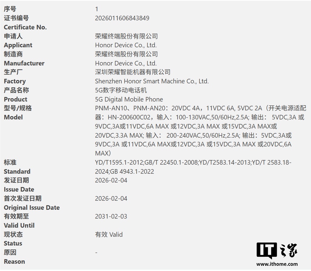 参考IT之家此前报道,型号 PNM-AN10(标准版)和 PNM-AN20(北斗版)已于 2 月 4 日通过中国质量认证中心的 3C 认证,基于此前 GSMA IMEI 数据库,该机型号对应荣耀 Magic V6 折叠手机。