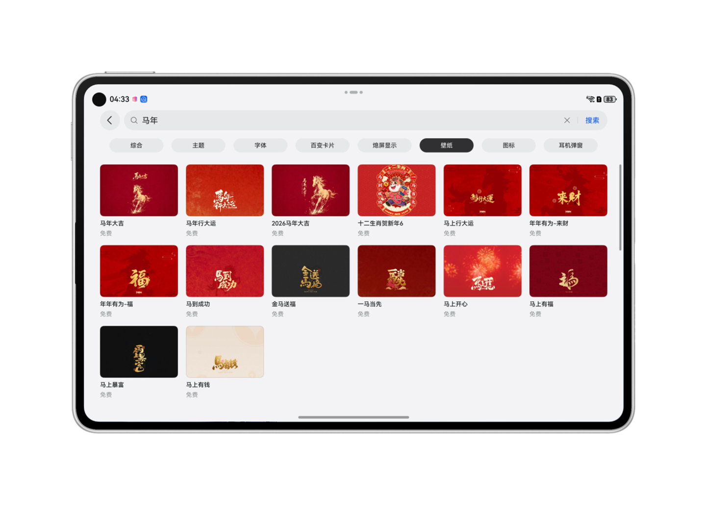 1.打开“主题”App,直接搜索“马年”,在壁纸分类中即可看到马年壁纸更新;