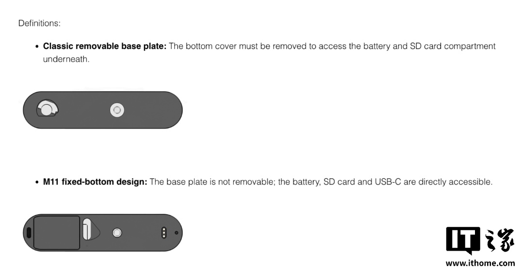 IT之家 2 月 16 日消息,徕卡 M 系统相机一度拥有可拆卸相机底盖(Base plate)设计,M3 - M7 时代是为了便于胶卷安装。M8 - M10R 数码时代则是为了“致敬经典”,在拆掉底盖后用户可以自由插拔 SD 卡和电池。