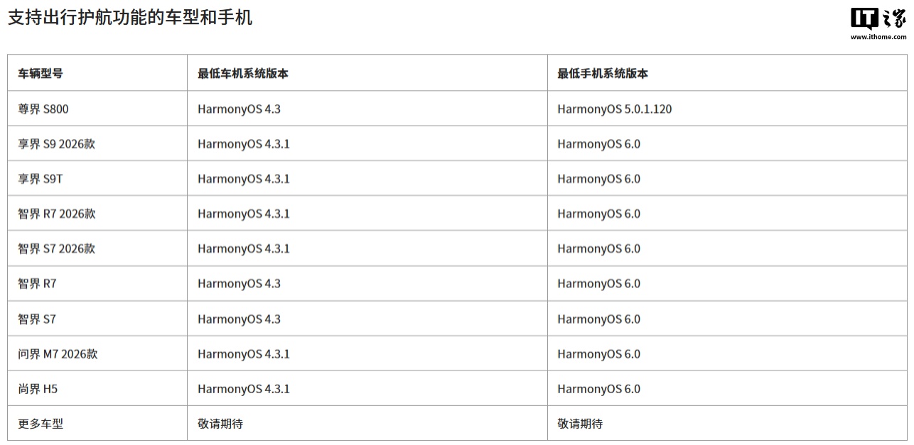在车端,该功能由尊界 S800 轿车首发。IT之家注意到,目前该功能已适配支持鸿蒙智行五界多款车型,具体如下: