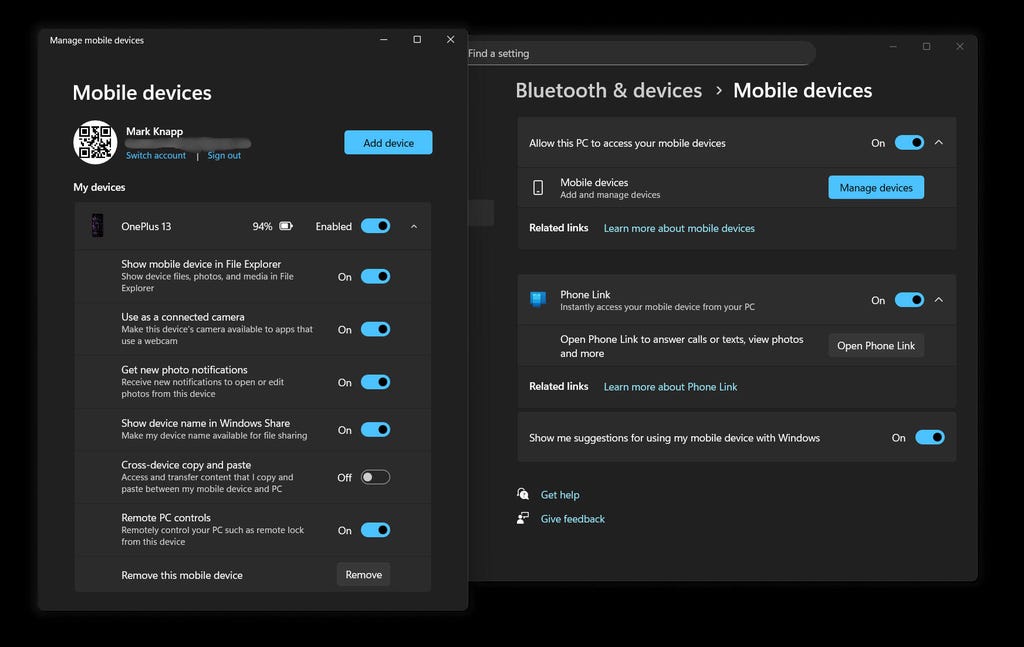 此外,还有一些隐藏功能。为确保所有功能均已启用,在Windows中,请前往设置>蓝牙和设备>移动设备>管理设备,然后为已配对的手机启用所有开关。