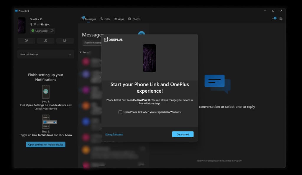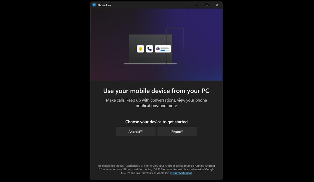 若你正在设置新的Windows PC,设置过程中可能会提示你激活Phone Link。否则,你可自行打开PC上的Phone Link程序开始设置。该程序兼容Windows 11及近期版本的Windows 10。
