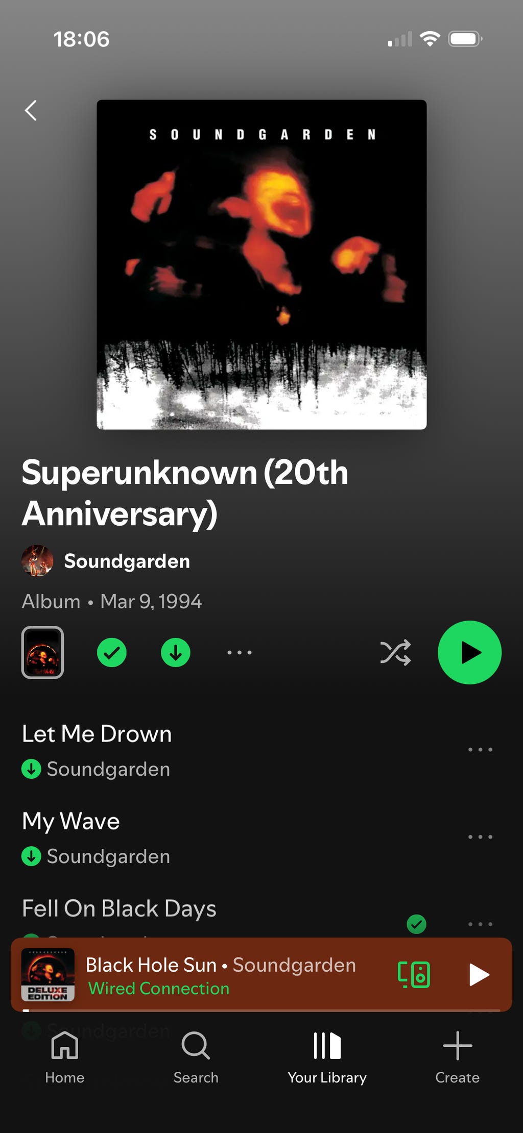 在Spotify上,你无法单独下载单首歌曲,但可以下载专辑或自定义播放列表。点击箭头图标将专辑或播放列表保存到你的库中。一旦下载完成,它们将标有绿色箭头图标。