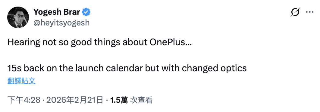 IT之家 2 月 22 日消息,消息人士 Yogesh Brar 今天在 X 平台透露,一加已经恢复 15s 手机的研发计划,但定位有所变化。