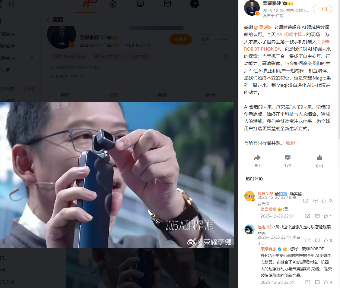 荣耀终端股份有限公司 CEO 李健去年 12 月分享称,吴晓波在 AI 闪耀中国的现场,展示了世界上第一款手机机器人 —— 荣耀 ROBOT PHONE。据介绍,该机集成了自主交互、行动能力和高清影像。